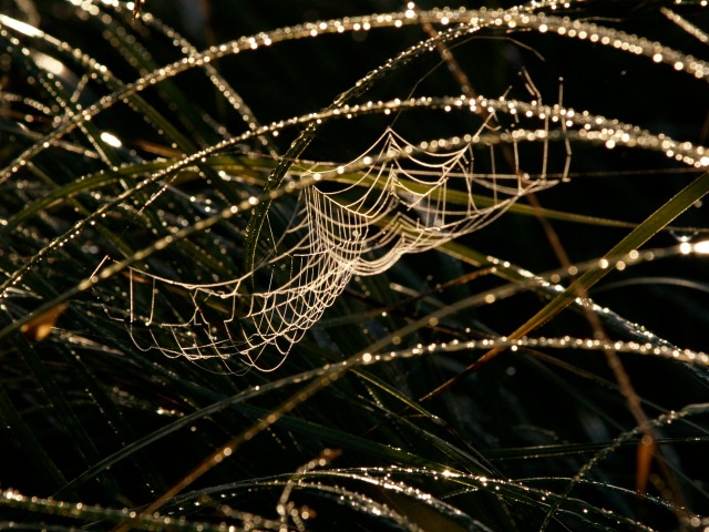 On any warm summer day, this spider web is suspended on these blades of grass: To read more visit next page, THE ESSAY CLOSET at: https://chasingtheperfectmoment.com/the-essay-closet/